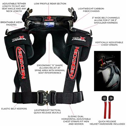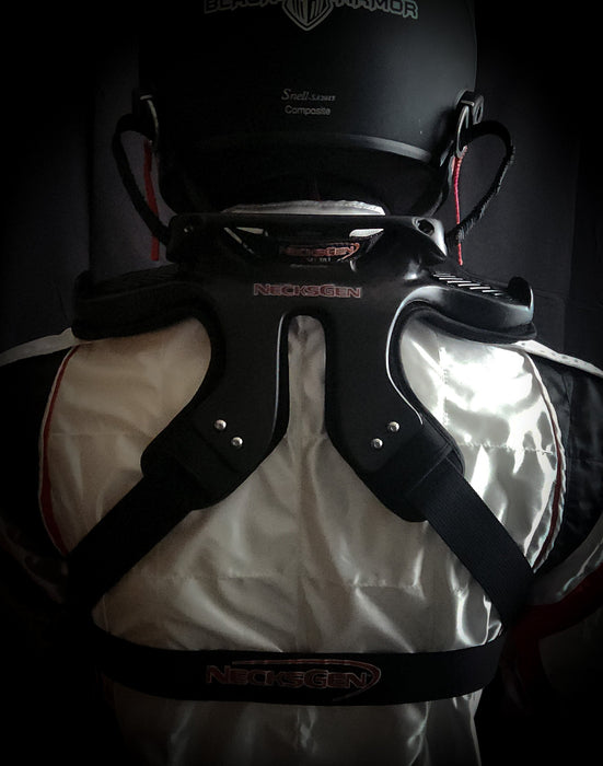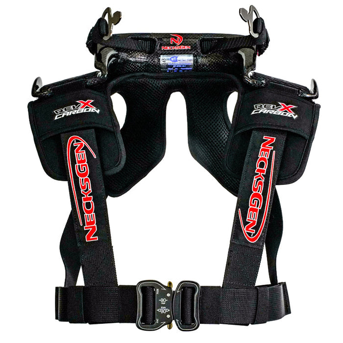 The REV X Carbon is NecksGen's newest head and neck restraint / frontal head restraint. Hand made from carbon fiber and lightweight materials, the new REV X adds an extra element to driver comfort. The X strap system holds the device securely in place while driving, and also helps keep it where you want it while getting in or out of the vehicle. The straps are easily adjustable to make personal fitment easy, and the double adjustable tactical buckle in front is easy to use. The vertical chest straps have some adjustment to fit men and women both easily.